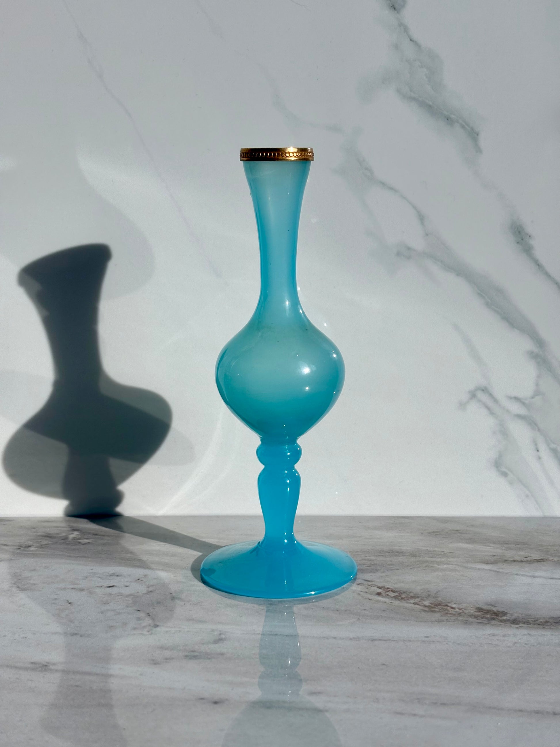 This miniature blue opaline vase is exquisitely mounted with ormolu, showcasing expert craftsmanship. Its rich blue glass combined with finely detailed gilt bronze accents makes it a distinguished piece.