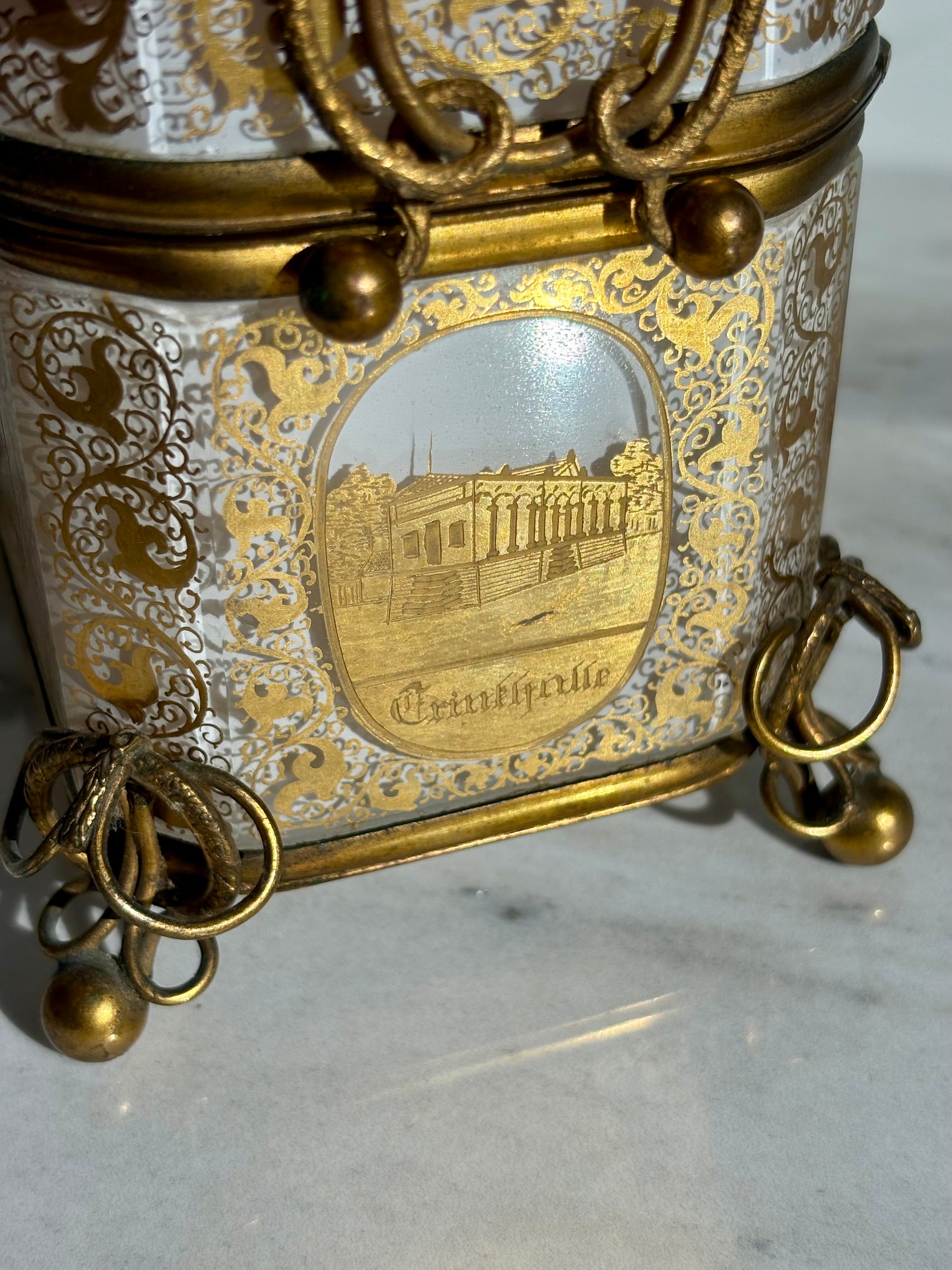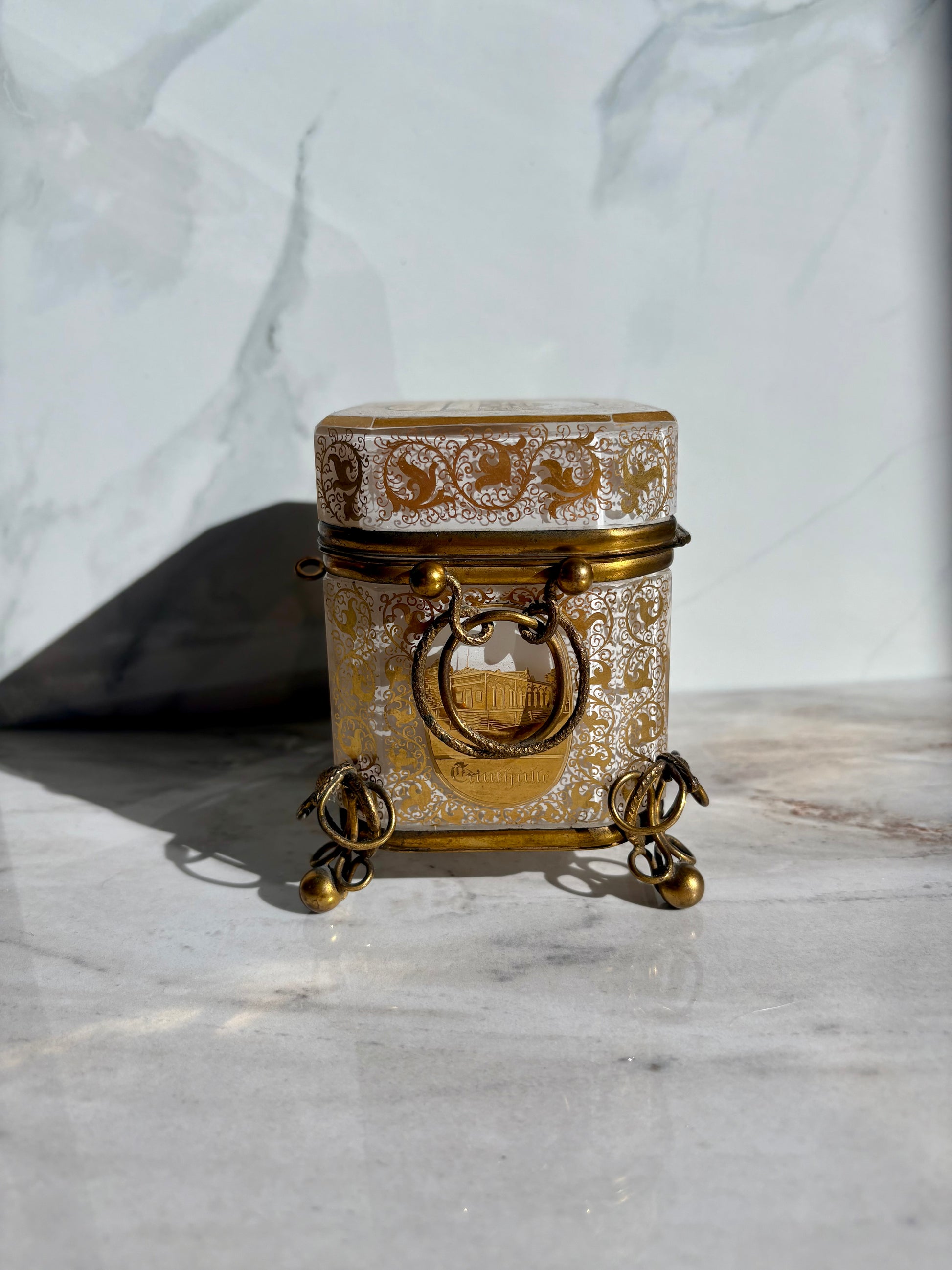 This Grand Tour Casket is a rare and exceptional example of antique Moser craftsmanship, featuring a distinctive double overlay design in white and clear glass. This unique piece is adorned with exquisite ormolu mounts and showcases meticulously hand-etched and hand-painted scenes of various European locations. (I believe this is a rare piece, I cannot find another one like it, and I do NOT use that term lightly).