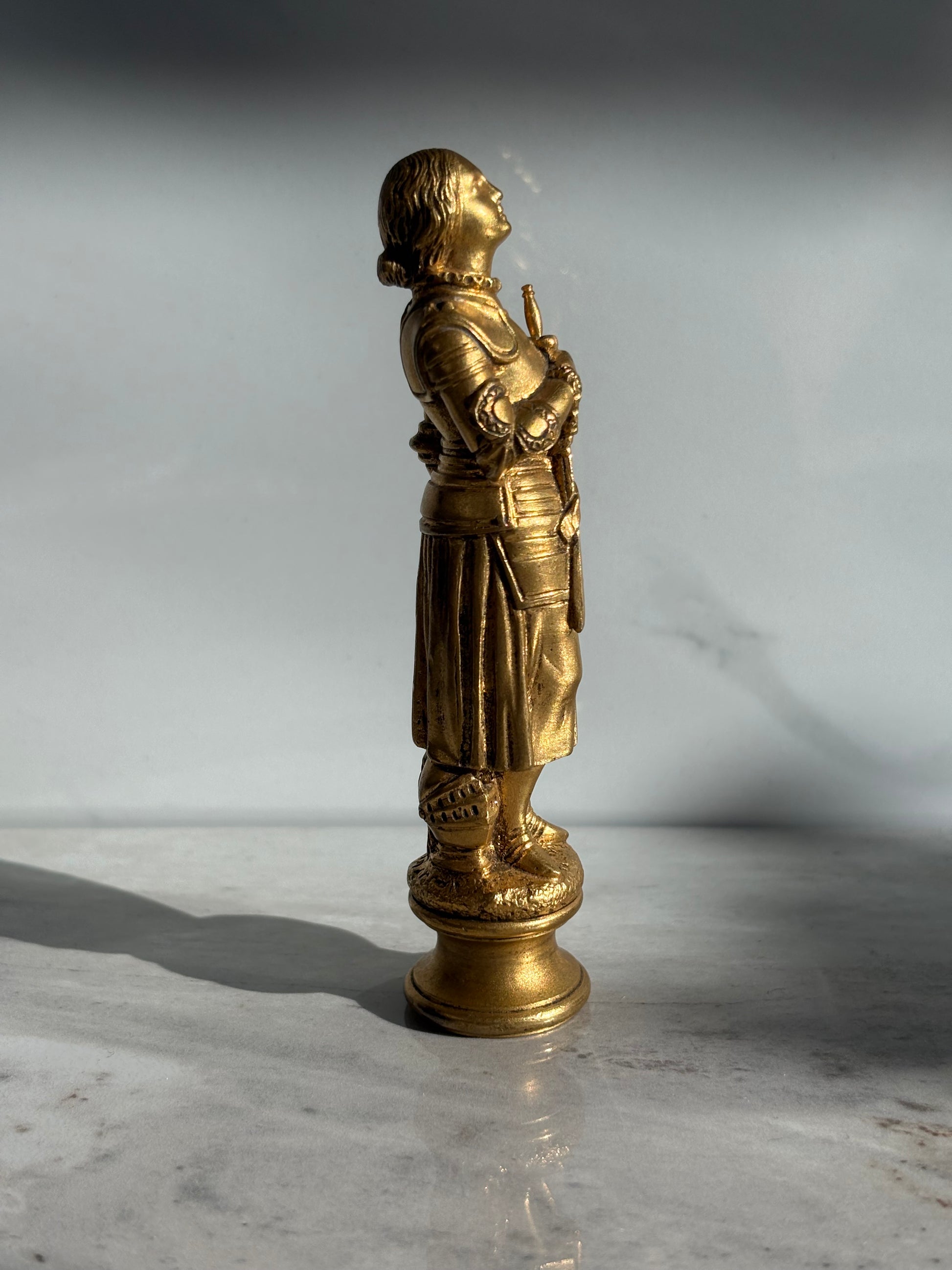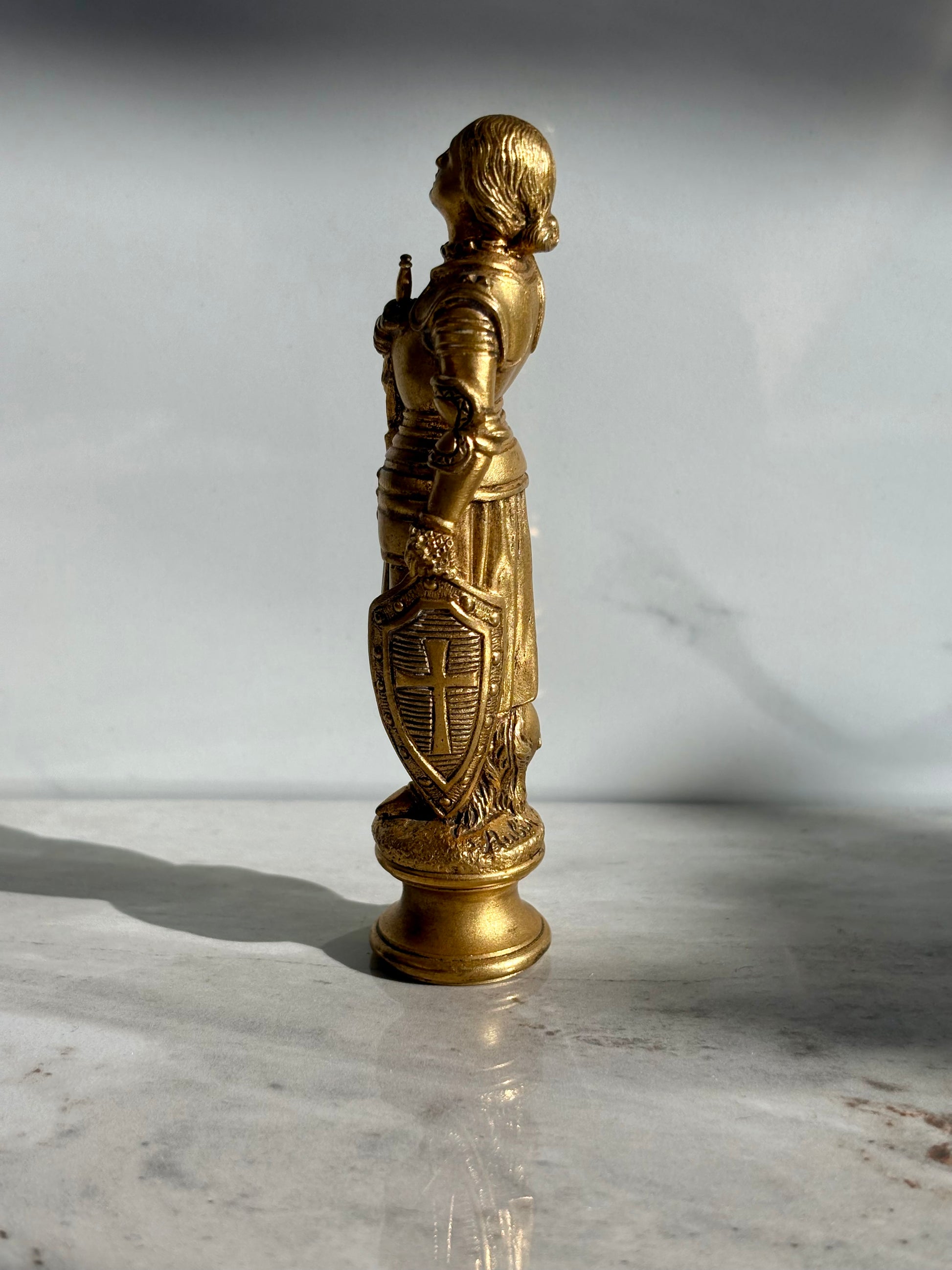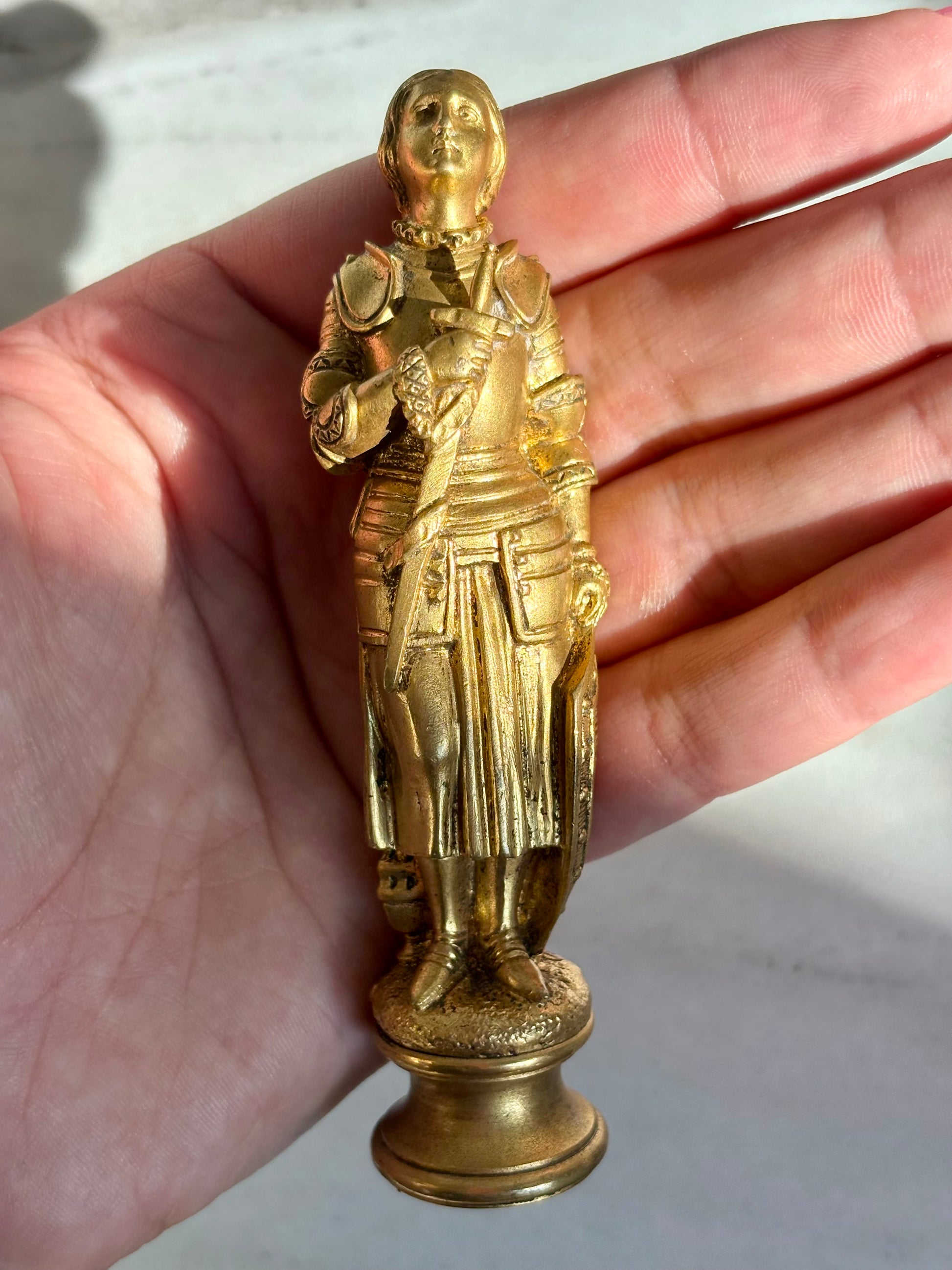 This Joan of Arc Wax Seal is a finely crafted piece in gilt bronze, showcasing intricate detailing of Joan of Arc holding a sword, accompanied by a knight’s helmet and a crusader shield. Also signed by the artist, it bears ‘PRH’ as the monogram on the seal. Joan of Arc embodies bravery, perseverance, and moral strength. In France, Joan is the ultimate national heroine, a unifying symbol of French pride and resilience, this piece combines artistic skill with rich symbolism.